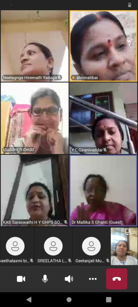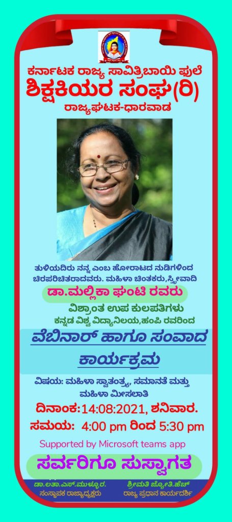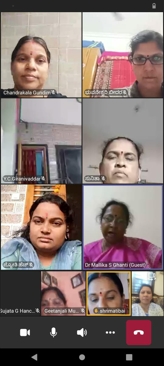 ದಿನಾಂಕ 14 /08/ 2021 ಶನಿವಾರ ಸಂಜೆ. 4 ಗಂಟೆಗೆ ಹೆಸರಾಂತ ಮಹಿಳಾಪರ ಹೋರಾಟಗಾರರು, ಸ್ತ್ರೀವಾದಿ ಚಿಂತಕರು .ರಾಜ್ಯಕ್ಕೆ ಚುರಪರಿಚಿತರು ಹಾಗೂ ಹಿರಿಯ ಸಾಹಿತಿಗಳು ಆದಂತಹ ಡಾ. ಮಲ್ಲಿಕಾ ಘಂಟಿ ಮೇಡಂ .ವಿಶ್ರಾಂತ ಉಪಕುಲಪತಿಗಳು ಕನ್ನಡ ವಿಶ್ವವಿದ್ಯಾನಿಲಯ ಹಂಪಿ ಇವರಿಂದ ಮಹಿಳಾ ಸ್ವಾತಂತ್ರ್ಯ ಸಮಾನತೆ ಮತ್ತು ಮಹಿಳಾ ಮೀಸಲಾತಿ ಎಂಬ ವಿಷಯದ ಕುರಿತು ವೆಬಿನಾರ್ ಹಾಗೂ ಸಂವಾದ ಕಾರ್ಯಕ್ರಮ ಅತ್ತ್ಯುತ್ತಮವಾಗಿ ಜರುಗಿತು.