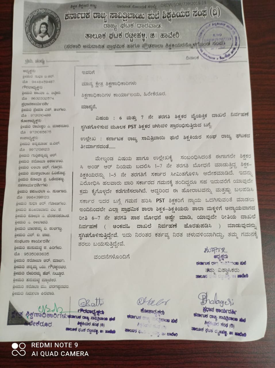 ಹಾವೇರಿ ಅ.22. ಕರ್ನಾಟಕ ರಾಜ್ಯ ಸಾವಿತ್ರಿಬಾಯಿ ಫುಲೆ ಶಿಕ್ಷಕಿಯರ ಸಂಘ ರಾಜ್ಯ ಘಟಕ ( ರಿ ) ಧಾರವಾಡ, ಜಿಲ್ಲಾ ಘಟಕ ಹಾವೇರಿ, ರಟ್ಟೀಹಳ್ಳಿ ತಾಲ್ಲೂಕು ಘಟಕದ ವತಿಯಿಂದ .ರಾಜ್ಯ ಘಟಕದ ತೀರ್ಮಾನದಂತೆ, 6 ಮತ್ತು 7 ನೇ ತರಗತಿ ಬೋದನೆಗೆ ಸಂಬಂಧಿಸಿದ ಶಿಕ್ಷಕರ ವೈಯಕ್ತಿಕ ದಾಖಲೆ ನಿರ್ವಹಣೆ ಸ್ಥಗಿತಗೊಳಿಸುವ ಮೂಲಕ PST ಶಿಕ್ಷಕರ ಚಳುವಳಿ ಪ್ರಾರಂಭಿಸಿದ್ದಾರೆ. ಹಿರೇಕೆರೂರಿನ ಕ್ಷೇತ್ರ ಶಿಕ್ಷಣಾಧಿಕಾರಿಗಳಿಗೆ ಮನವಿ ಸಲ್ಲಿಸಿದ್ದಾರೆ.ತಾಲೂಕಿನ ಶಿಕ್ಷಣಾಧಿಕಾರಿಗಳು ಇಲಾಖಾ ಕಾರ್ಯದ ನಿಮಿತ್ತ ಹಾವೇರಿಗೆ ಹೋಗಿದ್ದರಿಂದ ಅವರ ಅನುಪಸ್ಥಿತಿಯಲ್ಲಿ ತಾಲೂಕಿನ ದೈಹಿಕ ಪರಿವೀಕ್ಷಕರಾದ, ಶ್ರೀ M. B. Makandar. ಸರ್ ರವರಿಗೆ ಸಲ್ಲಿಸಿದೆ ಎಂದು ತಾಲ್ಲೂಕಿನ ಅದ್ಯಕ್ಷರು ತಿಳಿಸಿದ್ದಾರೆ.ಹಾಗೂ ನಮ್ಮ ಸಂಘದ ವತಿಯಿಂದ, ತಾಲೂಕಿನ ಜಿಲ್ಲಾ ಪದಾಧಿಕಾರಿಗಳು, ತಾಲೂಕಿನ ಅಧ್ಯಕ್ಷರು, ಗೌರವಅಧ್ಯಕ್ಷರು, ಕಾರ್ಯದರ್ಶಿಗಳು, ಕೋಶಾಧ್ಯಕ್ಷರು, ಉಪಾಧ್ಯಕ್ಷರು, ಸಹಕಾರ್ಯದರ್ಶಿಗಳು, ಸಂಘಟನಾ ಕಾರ್ಯದರ್ಶಿಗಳು ಹಾಜರಿದ್ದು ಎಲ್ಲರಿಗೂ ಧನ್ಯವಾದಗಳನ್ನು ಅರ್ಪಿಸಿದ್ದಾರೆ.