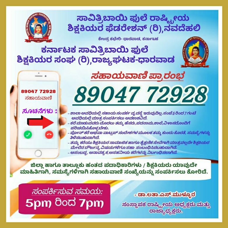 ಧಾರವಾಡ.ಜ.22 ಇಂದು ಧಾರವಾಡ ಶಹರದಲ್ಲಿನ ಡಾ.ಪಾಟೀಲ್ ಪುಟ್ಟಪ್ಪರವರ ಸಭಾಭವನದಲ್ಲಿ ನಡೆದ ಮಾತೇ ಸಾವಿತ್ರಿಬಾಯಿ ಫುಲೆರವರ ಜನ್ಮದಿನಾಚರಣೆ ಹಾಗೂ ಶೈಕ್ಷಣಿಕ ಕಾರ್ಯಾಗಾರ ಸಮಾರಂಭವನ್ನು ಉದ್ಘಾಟನೆ ಮಾಡಿದ ವಿಧಾನಪರಿಷತ್ ಸಭಾಪತಿಗಳಾದ ಗೌರವಾನ್ವಿತ ಸನ್ಮಾನ್ಯ ಶ್ರೀ ಬಸವರಾಜ ಹೊರಟ್ಟಿ ರವರು ಹಾಗೂ ಅವರ ಜೊತೆಯಾಗಿ ಸಾವಿತ್ರಿಬಾಯಿ ಫುಲೆ ಚಲನಚಿತ್ರದ ನಿರ್ಮಾಕರಾದ ಶ್ರೀ ಬಸವರಾಜ ಭೂತಾಳಿರವರು ಹಾಗೂ ವೇದಿಕೆಯ ಗಣ್ಯರೆಲ್ಲರೂ ಸಾಮೂಹಿಕವಾಗಿ ಸಂಘದ ಸಹಾಯವಾಣಿ ಮತ್ತು ವೆಬ್ಸೈಟ್ URLs ಬಿಡುಗಡೆ ಮಾಡಿದರು.