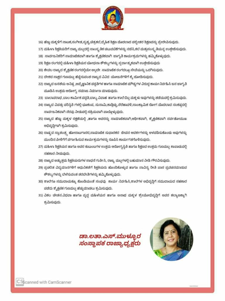 ಸಂಸ್ಥಾಪಕ ರಾಷ್ಟ್ರೀಯ ಅಧ್ಯಕ್ಷರು ಹಾಗೂ ರಾಜ್ಯಾಧ್ಯಕ್ಷರು:- ಡಾ.ಲತಾ.ಎಸ್.ಮುಳ್ಳೂರ,ಕರ್ನಾಟಕ