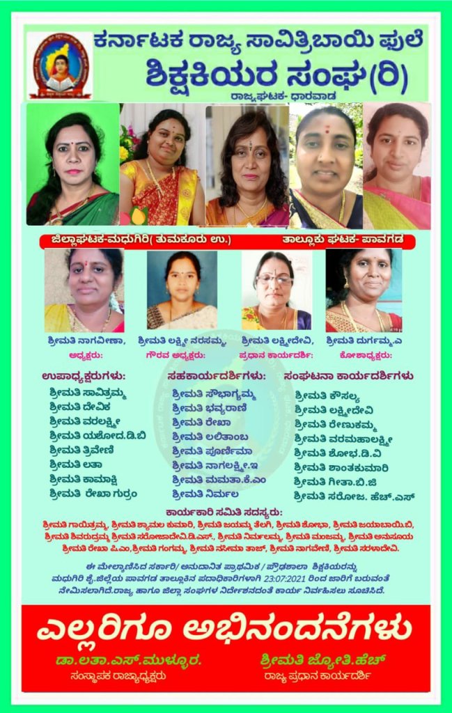 ಮಧುಗಿರಿ ಜು.24 ಕರ್ನಾಟಕ ರಾಜ್ಯ ಸಾವಿತ್ರಿಬಾಯಿ ಫುಲೆ ಶಿಕ್ಷಕರ ಸಂಘ ರಾಜ್ಯ ಘಟಕ- ಧಾರವಾಡ ಜಿಲ್ಲಾ ಘಟಕ- ಮಧುಗಿರಿ ತಾಲ್ಲೂಕು ಘಟಕ- ಪಾವಗಡ